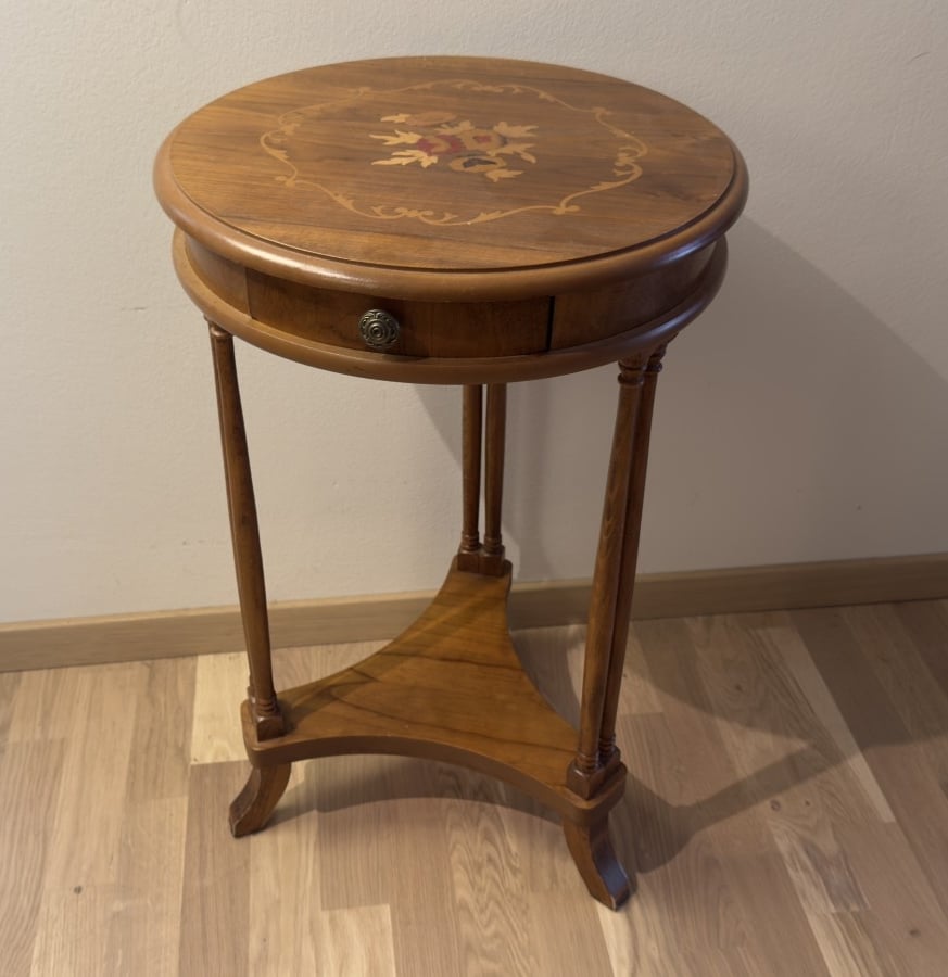 • Runder Italienischer Vintage Tisch mit Schublade, Intarsien Dm. 44cm H 71 cm