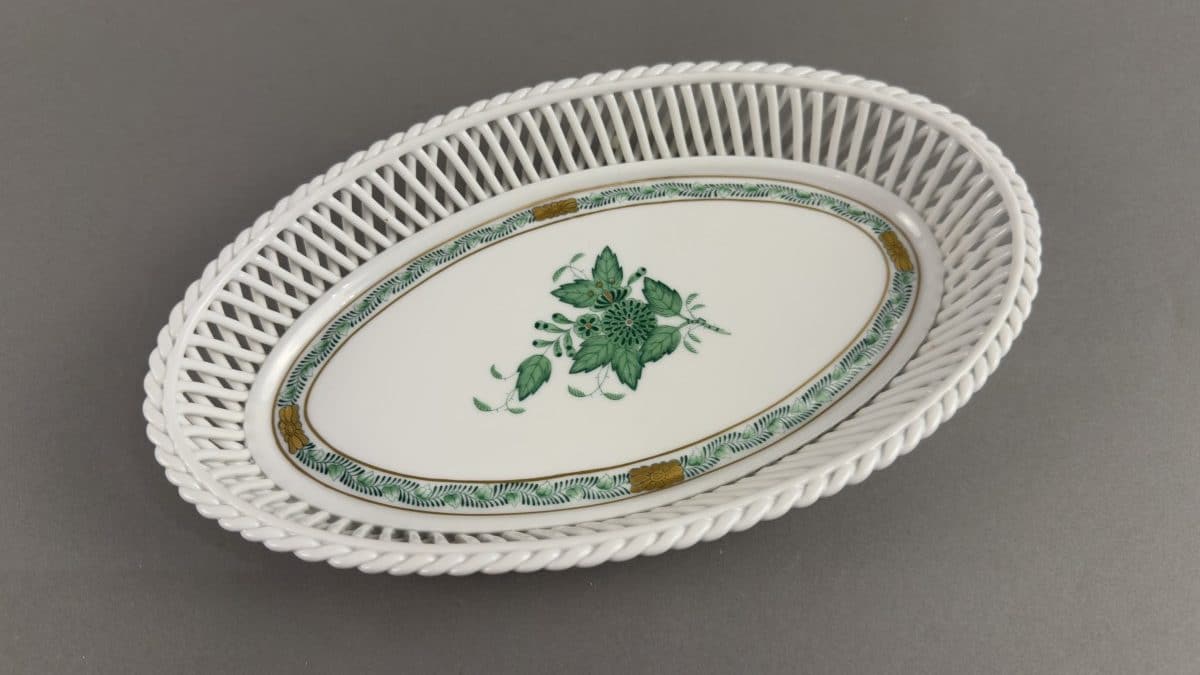 • Ovale Korbschale, Herend, Porzellan, Dekor AV Apponyi Vert Länge 26,5 cm, blaue Marke