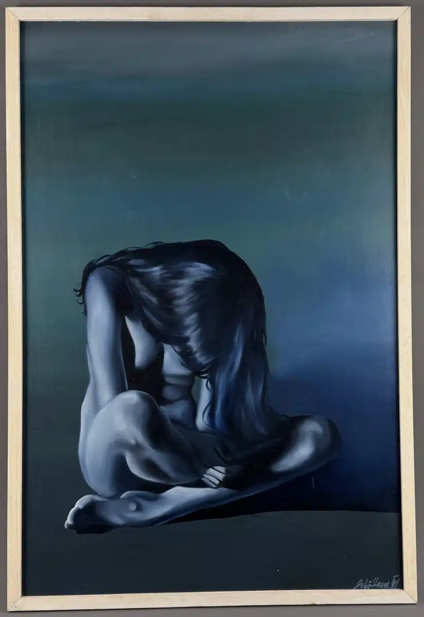 • Robert Schöffmann (Villach 1963-2011) Öl Akryl auf Hartfaserplatte, Frühwerk, Blaue Phase, handsigniert, datiert 1981, gesamt 93×62 cm ( Buch ist nicht Teil der Auktion ) OHNE BUCH !!
