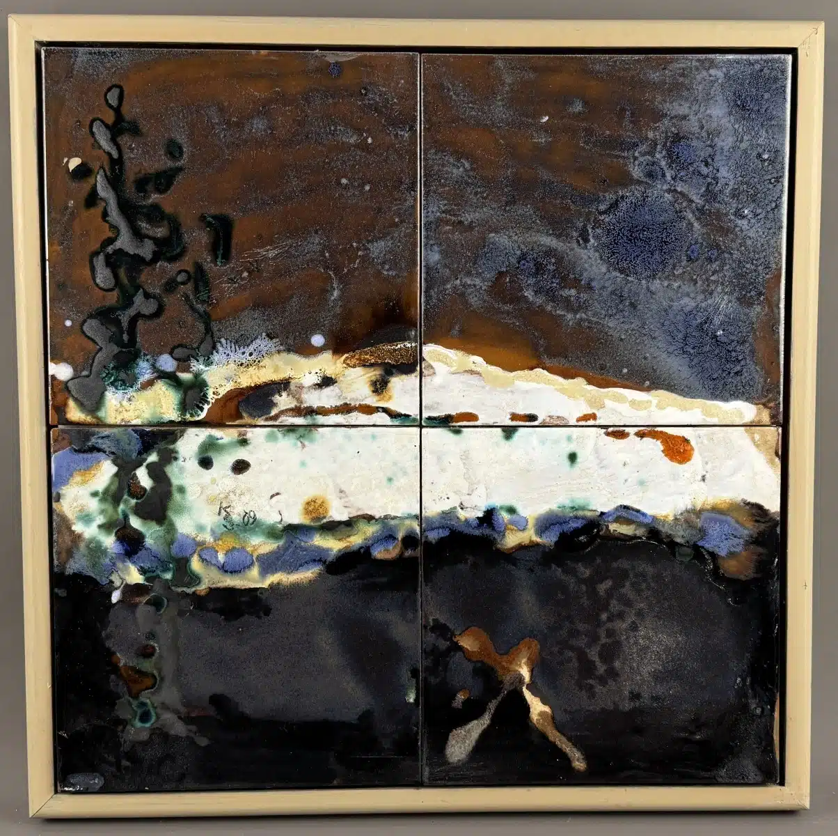 • Karl Schüssler (Wolfsberg 1941-2010) „Ohne Titel“, 4 Platten, Keramik, glasiert, in der Keramik Signatur, KS 09, Holzrahmen, 56×56 cm