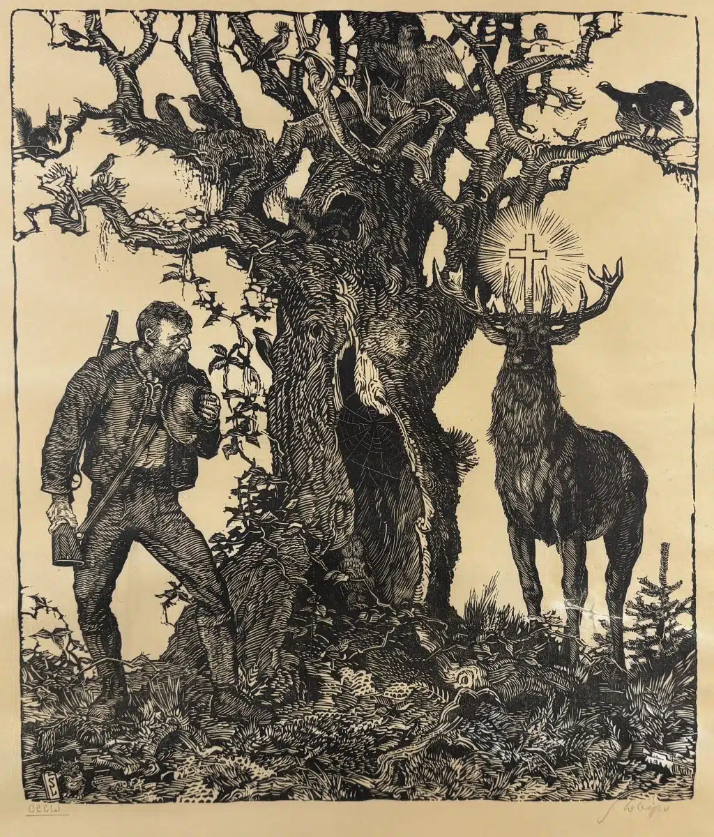 • Switbert Lobisser (Tiffen 1878-1943 Klagenfurt, Studium an der Wiener Akademie Mitglied Wiener Künstlerhaus) „St. Hubertus“, im Stock monogrammiert SL, Holzschnitt, op. 351, signiert, Stockgröße 45×39 cm, verglast, gerahmt, gesamt 64×51 cm