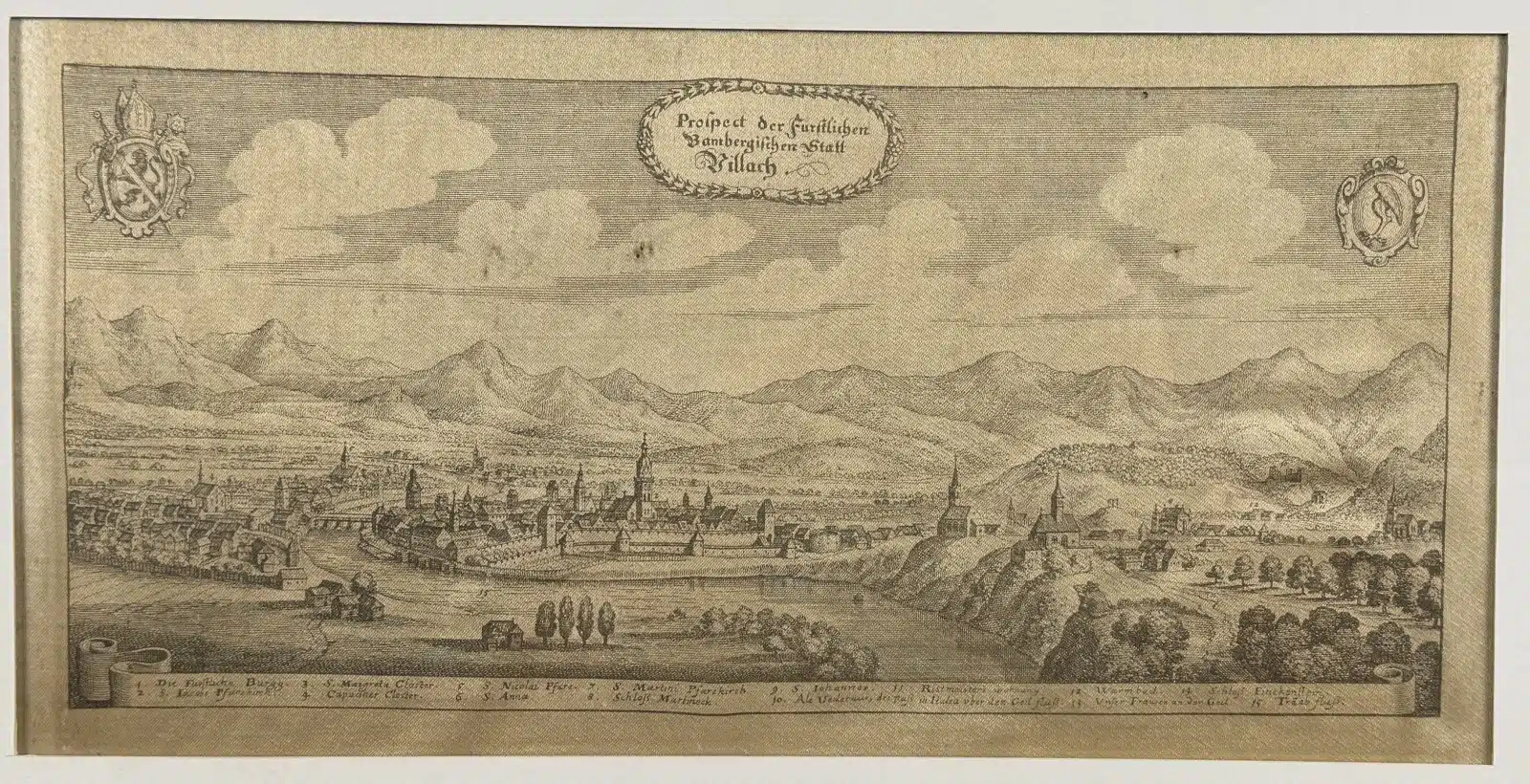 • Prospect der Fürstlichen Bambergischen Statt Villach, Druck ? auf Seide, von Matthäus Merian 1649, 42×21 cm gesamt 60×39 cm