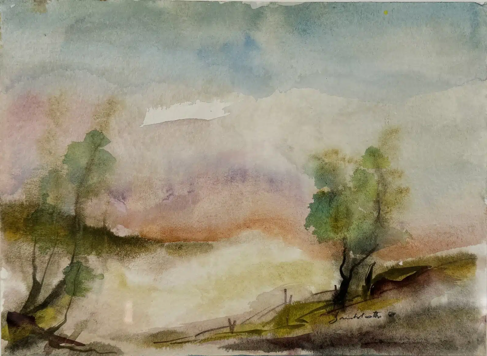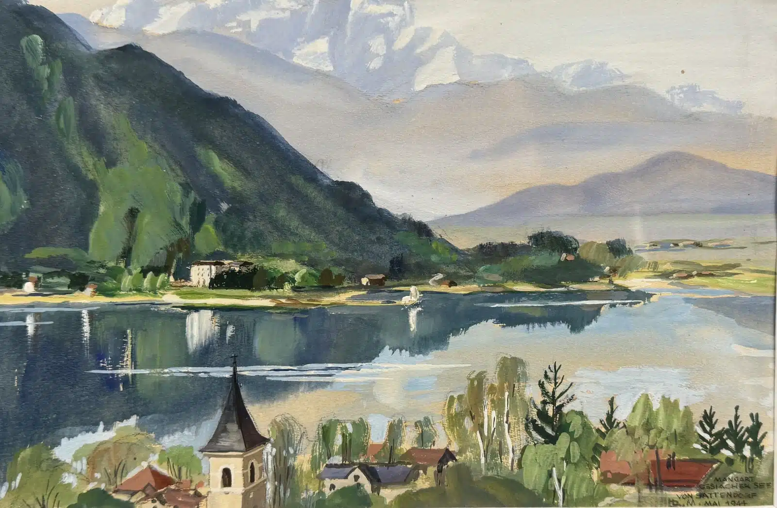 • Aquarell, Ossiachersee, Annenheim Lido,1944, 29×19 cm, beschrieben Mangart von Sattendorf, Monogramm unleserlich, gesamt 43×33 cm
