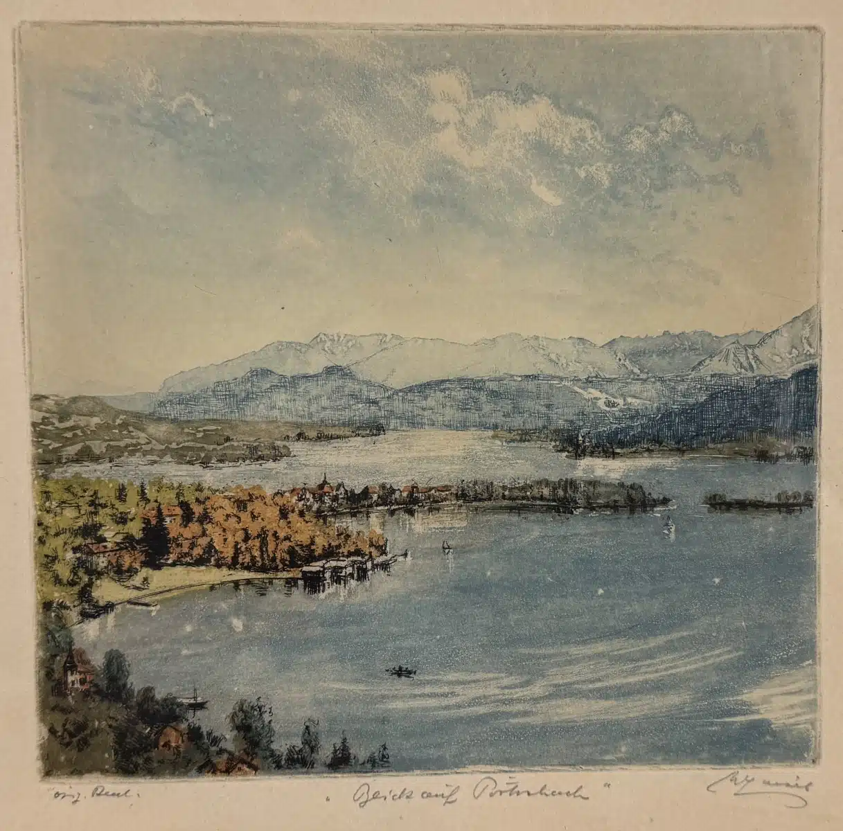 • Wilhelm Loisel (geb. 1914 Radsberg/Kärnten, Ausbildung an der Wiener Akademie unter Larwin und Fahringer) Farbradierung, Blick auf Pörtschach, signiert, 18×17 cm verglast, gerahmt gesamt 32x31cm