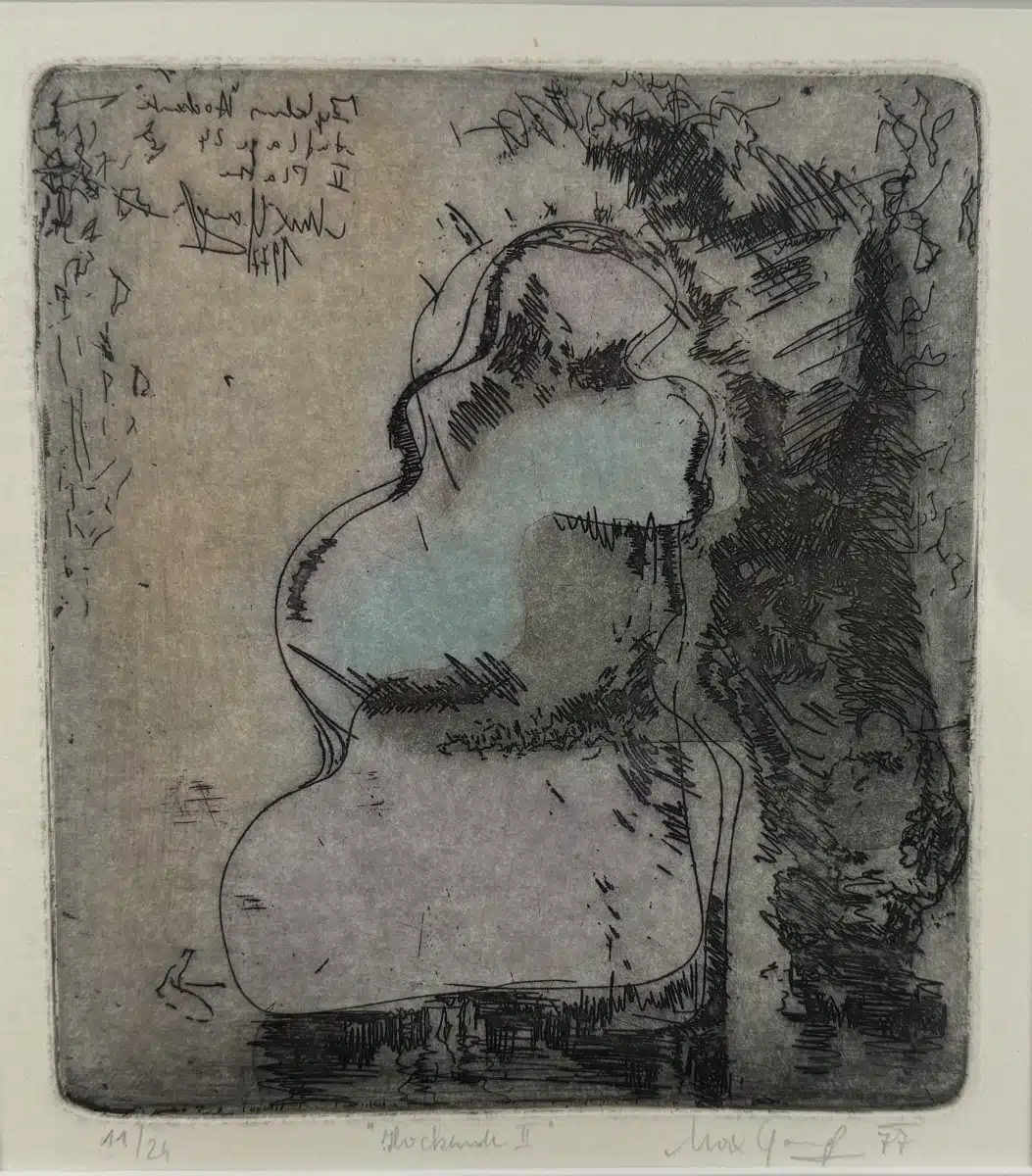 • Max Gangl (Mauthen/Kärnten 1946 geb.) Radierung, Hockende II, signiert Max Gangl, datiert 77, die Nr. 11/24, 22×20 cm, gerahmt, verglast gesamt 55×45 cm