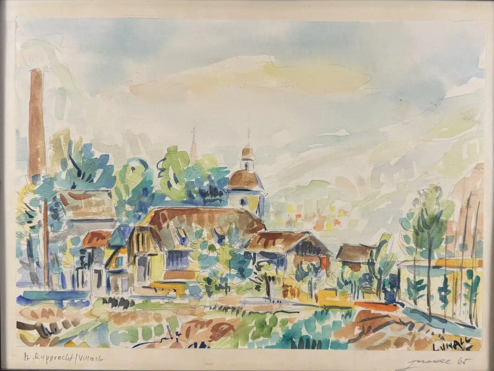 • Ludwig Walter (Luwall) (1912 geb., tätig in Villach) Aquarell, St. Rupprecht bei Villach, 37×26 cm, gerahmt, gesamt 44×34 cm