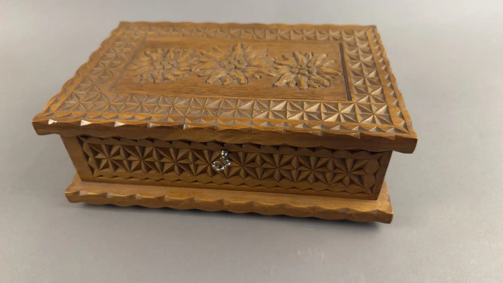 • vintage Holzschatulle . Schatzkiste mit Schlüssel 24×18 H 9 cm