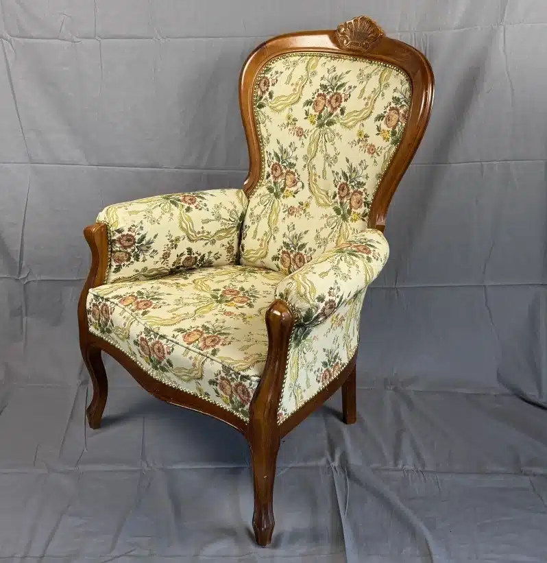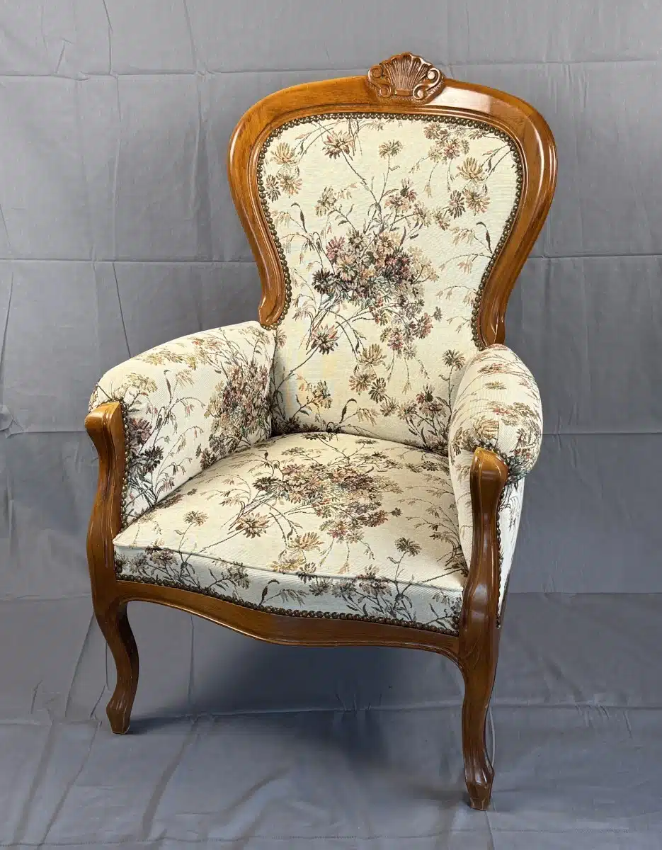 • Vintage Sessel im Biedermeier Design mit ornamentalen Schnitzereien Lehn- und Armstützentapezierung