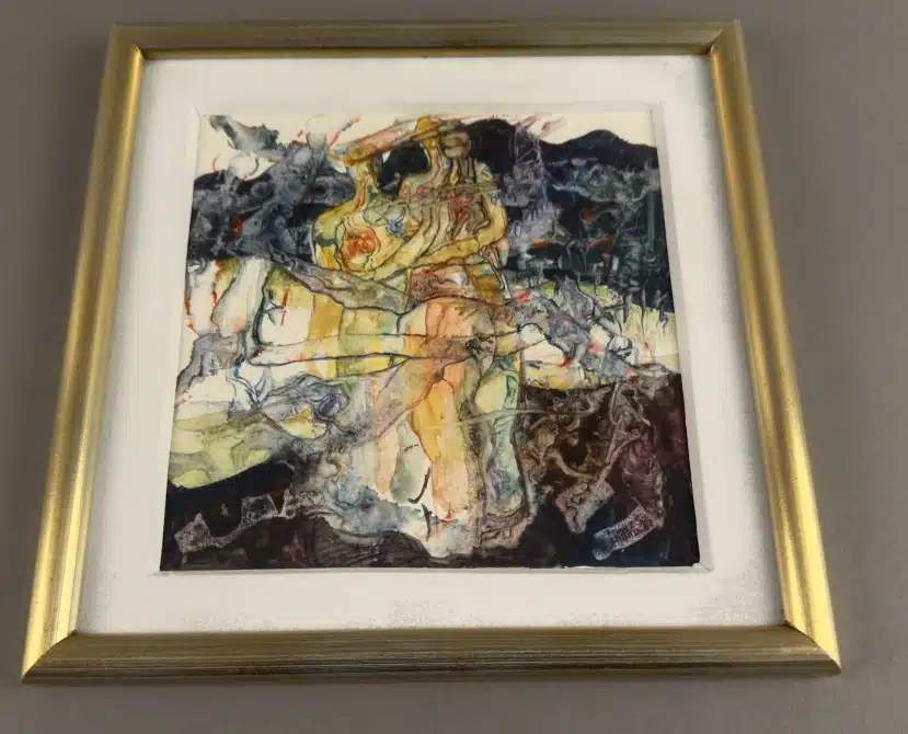• Caroline (Graz 1940 geb.) signiert Caroline, 45 x 55 cm datiert 94, Mischtechnik – Colage auf Papier, gerahmt, verglast