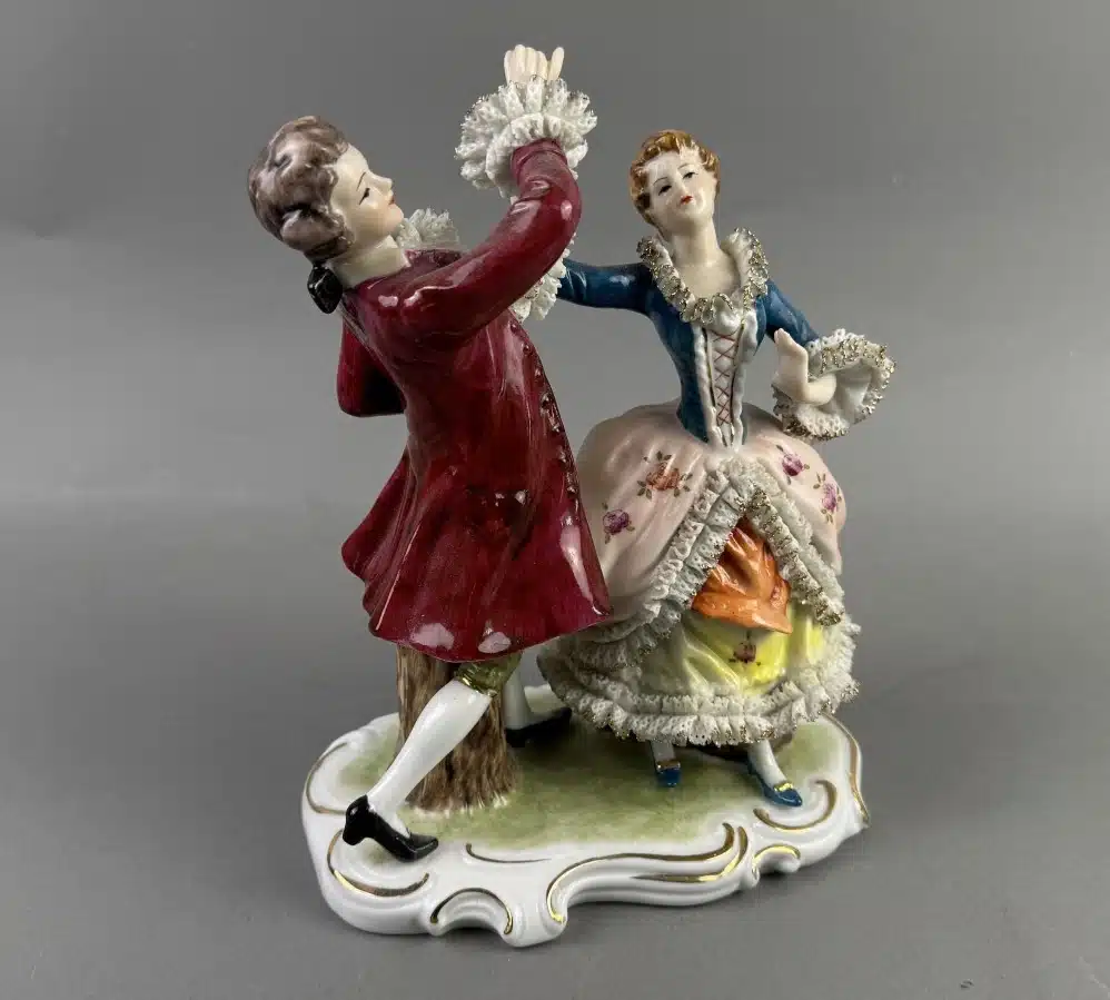 • Tanzendes Paar, Porzellan, Tuchspitzenbesatz, bunt und gold staffiert, Höhe 25 cm, Tuchspitzenbesatz bestoßen und Figur gklebt