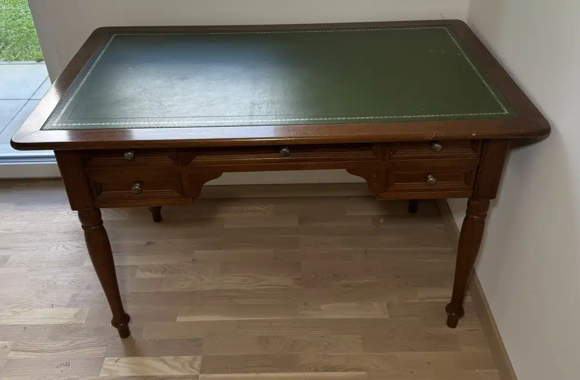 • Schreibtisch – Schreibfläche mit grünem Belag, 5 Schubladen, eleganten gedrechselten Beine 126×77 cm H 79 cm