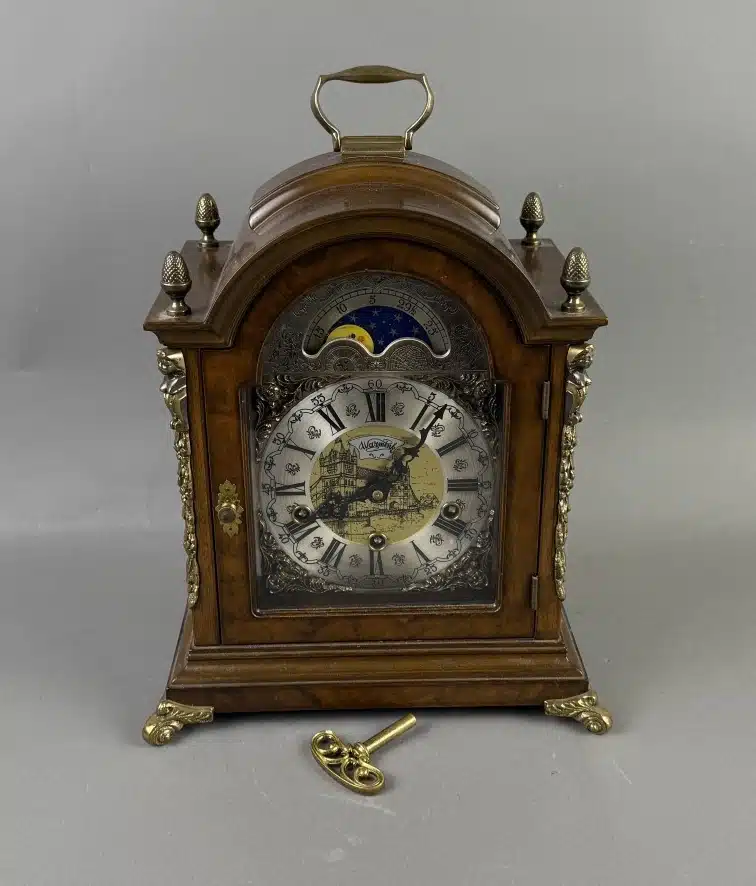 • Kommodenuhr John Warmink im Barockstil Zifferblatt mit Mondphasenanzeige, römische Ziffern, braun mattiertes Holzgehäuse mit Gelbmetallapplikationen, Höhe ca. 39 cm, 1 Schlüssel,