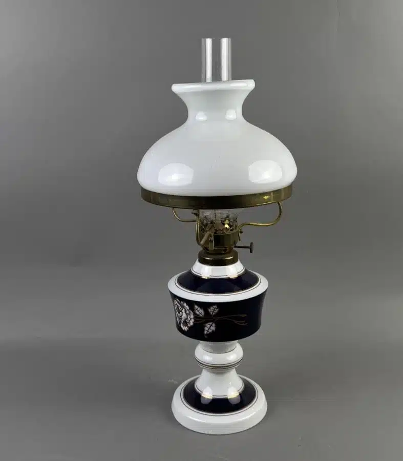 • Petroleum Lampe  Wallendorf Porzellan Echt Kobalt blaue Blume GDR DDR H.49cm