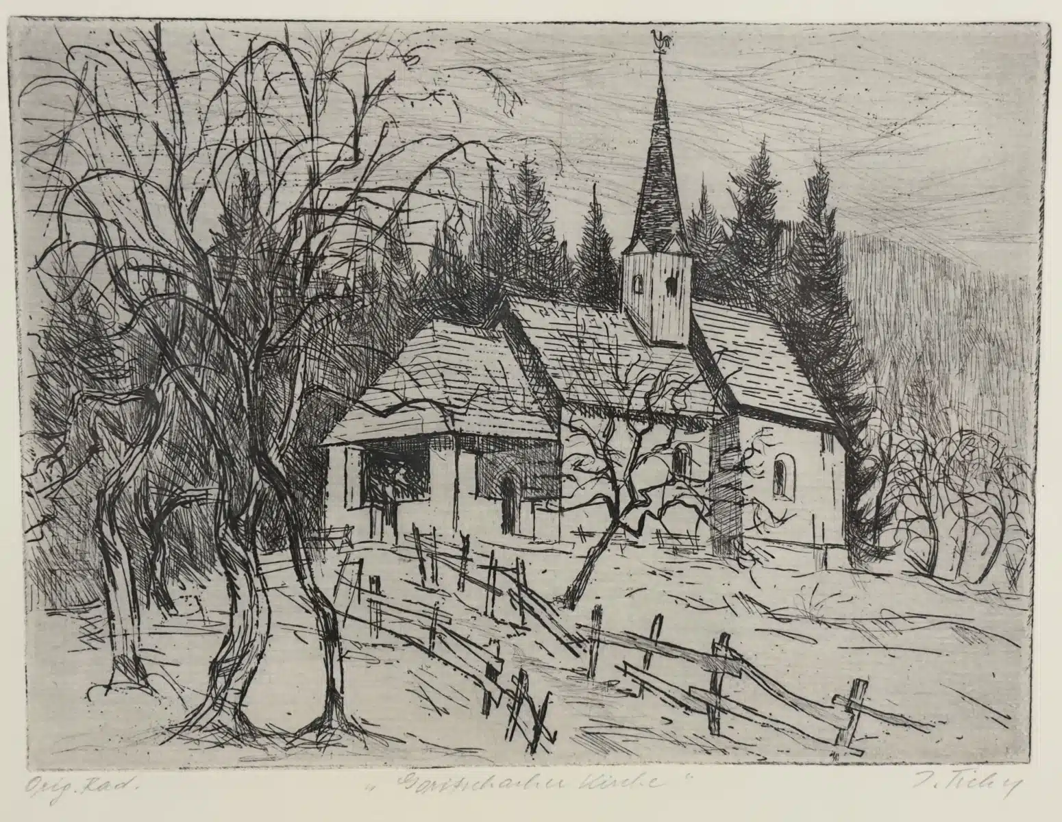 • Josef Tichy (Pörtschach 1922-2001) Radierung, Goritschacher Kirche, signiert J. Tichy, 22×16 cm Rahmen 41×30 cm