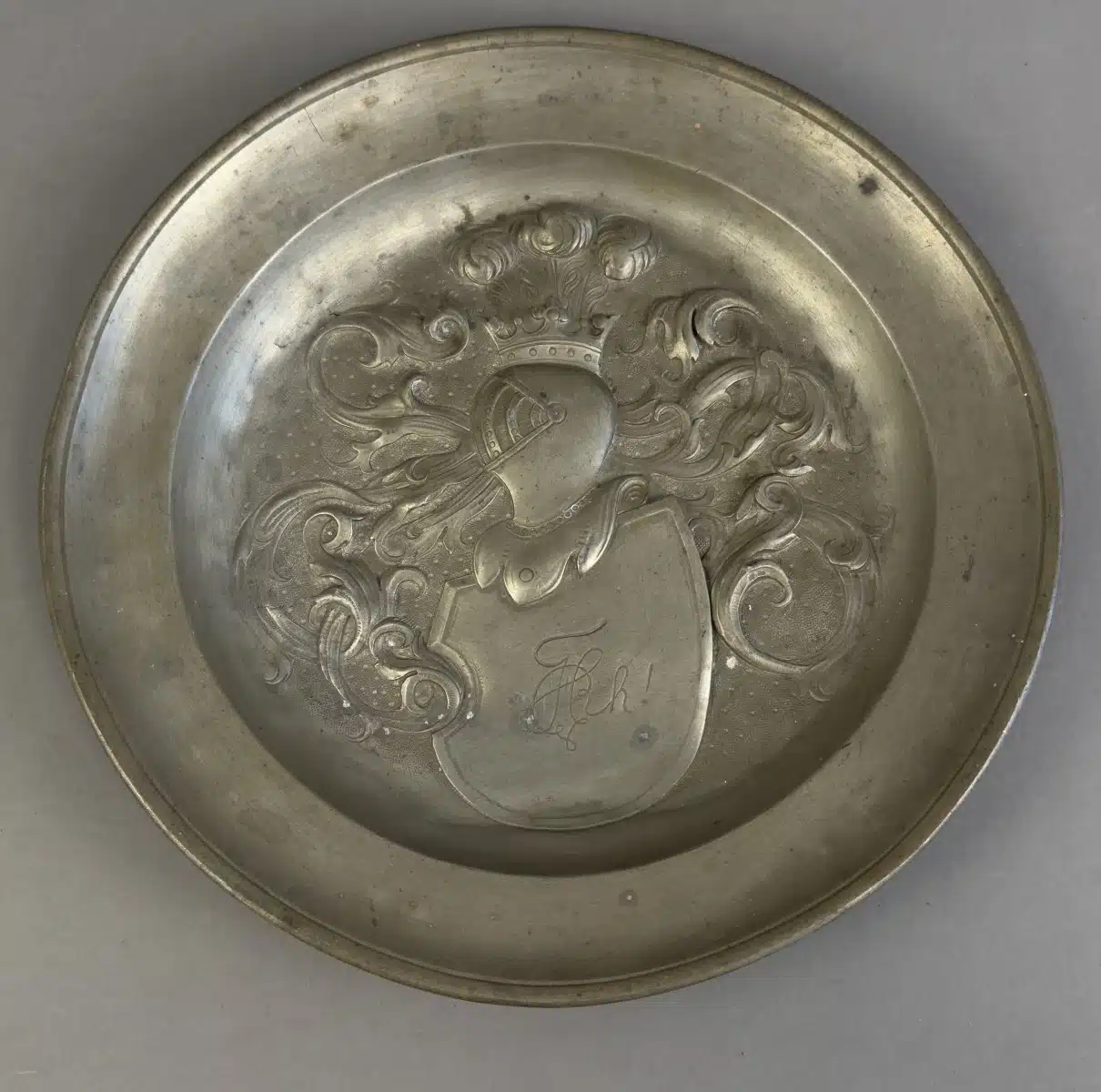 • Switbert Lobisser – Aus persönlichem Besitz – Zinnteller, Wappen, Schild, Helm und Krone Dm. 28 cm