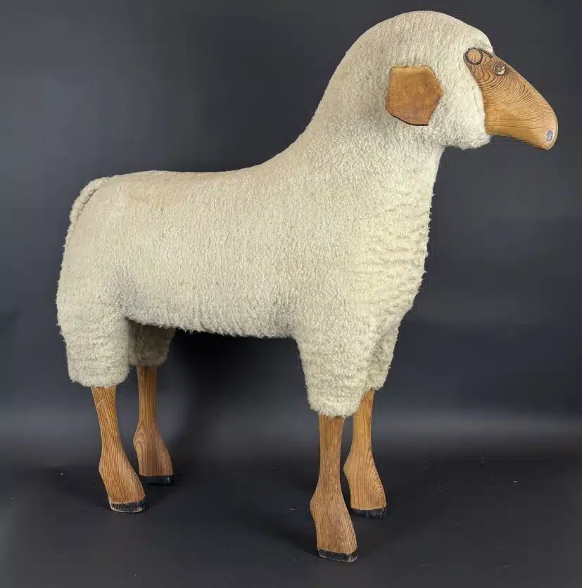 • Schaf-Hocker, entworfen von dem deutschen Designer Hanns-Peter Krafft für die Firma Meier. Germany. Deutschland, 1970er, Lebensgroßes handgefertigtes weißes Wollschaf L 90 cm H 86 cm