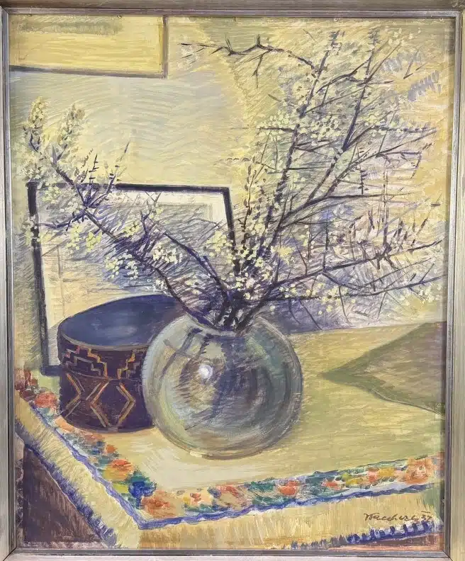 • Raimund Kalcher, (Villach 1889-1959) Öl auf Karton, signiert, datiert Kalcher. 37, 56×55 cm Rahmen 77×65 cm, Stillleben-Arrangement mit blühenden Zweigen in einer runden Glasvase,