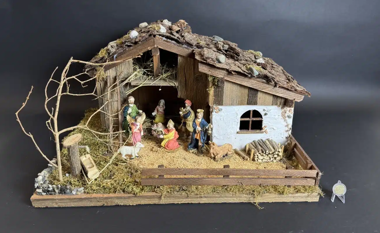 •  Weihnachtskrippe, die die Geburt Jesu. Die Krippe zeigt die Szene mit dem neugeborenen Jesuskind, Maria und Josef sowie den Heiligen Drei Königen, Hirten und Tieren, 55×36 cm H 33 cm