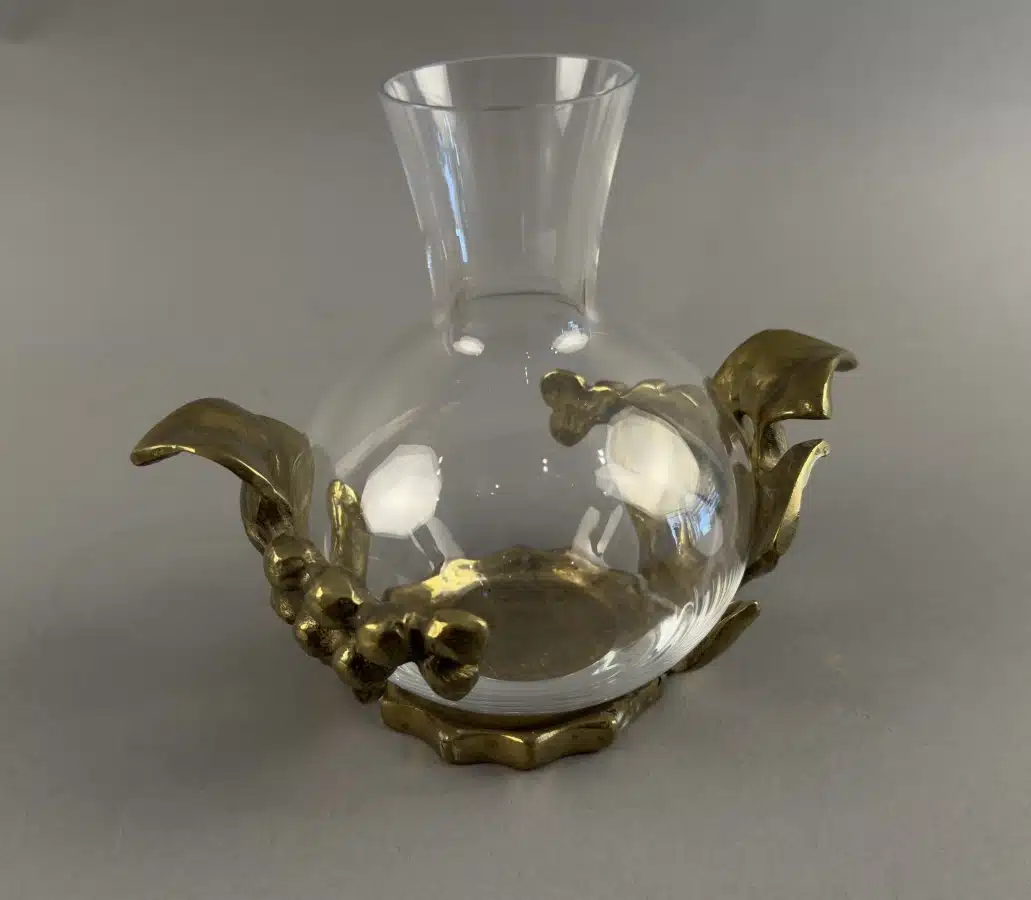 • Heinz Goll – Wein Dekanter gefangen im Messingguss – mit Weinreben Ausführung Gießerei „Kurt Jesch“ Bleiburg, H 16 cm