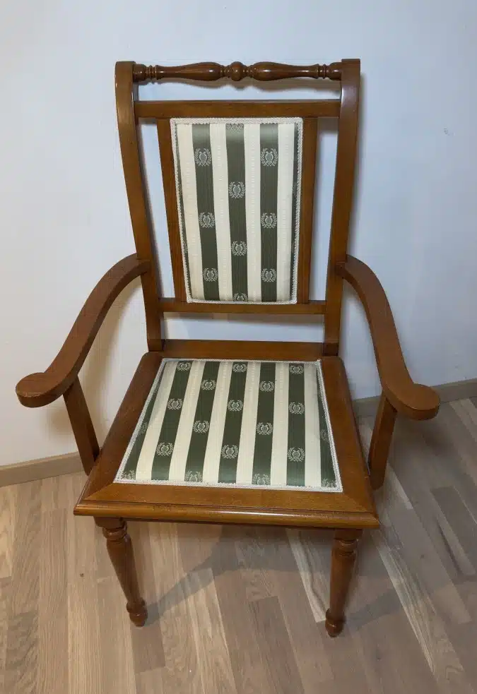 • Vollholz Stuhl mit Armlehnen und klassischem Polster