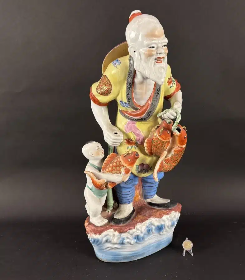 • Porzellan, chinesischen Fischer „Fischer und Kind“ H 60 x25 cm Restauriert