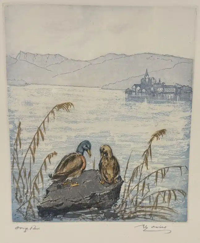 • Wilhelm Loisel, (Radsberg b. Klgft.1914-2005) Entenmotiv, signiert W Loisel, Farbradierung, 18×15 Rahmen 39×29 cm