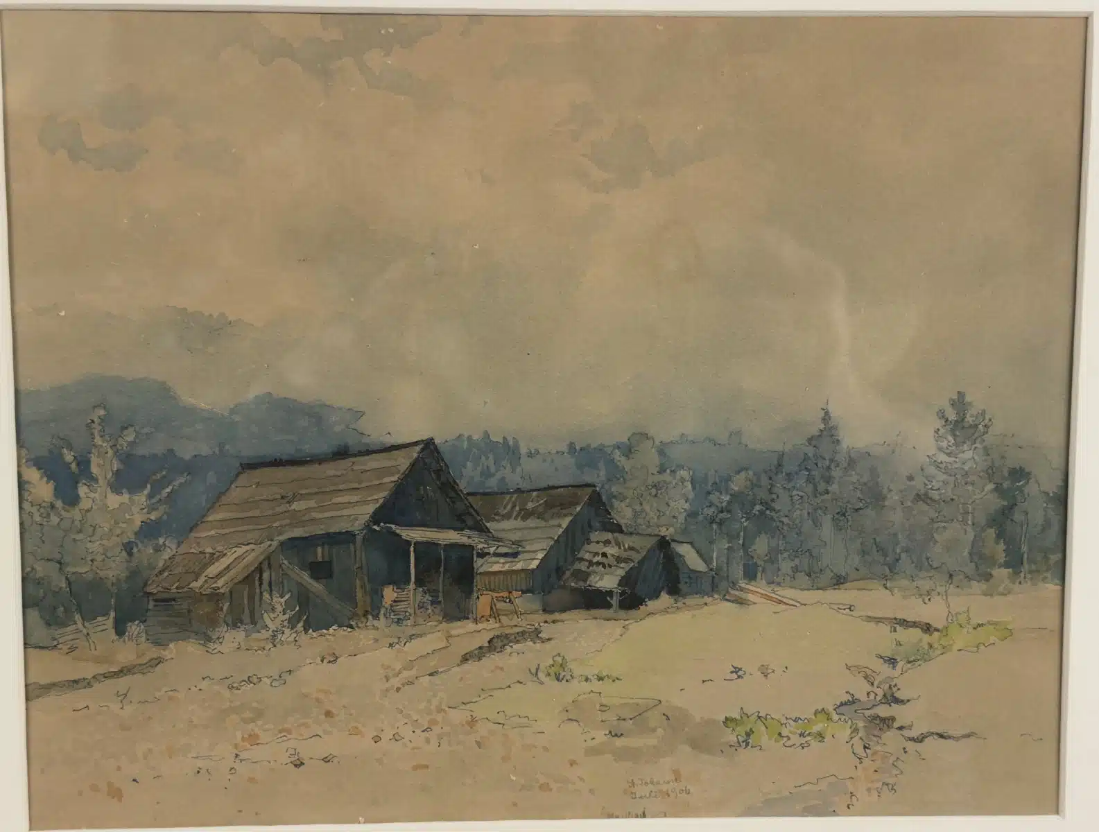 • Eduard Manhart (Klagenfurt 1880-1945) Landschaftsmotiv mit Stallungen, St. Johann Juli 1906, signiert 24×18 cm Rahmen 34×28 cm
