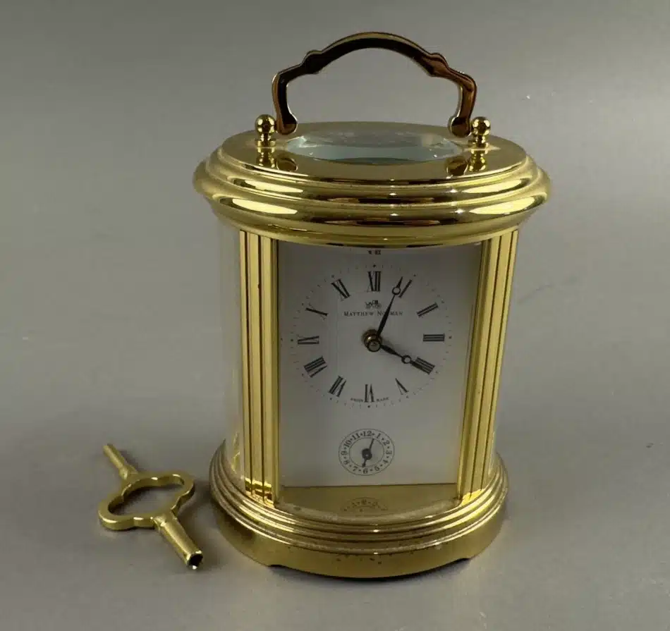 • Miniatur Reisewecker „Matthew Norman“ Schweiz um 1980, gepflegter Zustand, 1 Schlüssel, H 10 cm
