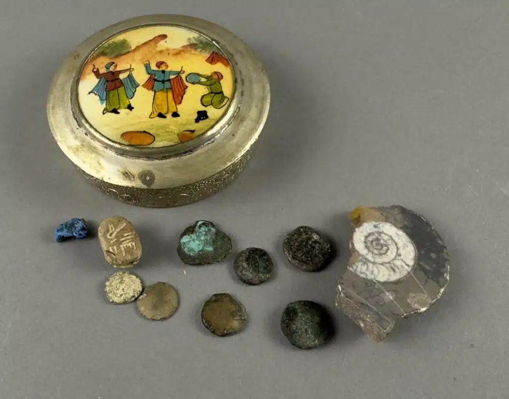 • Deckeldose mit Antiken Münzen und Versteinerung siehe Bilder