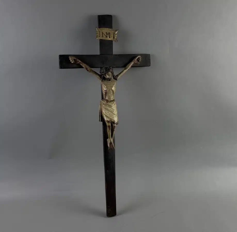• Kruzifix, 19. Jahrhundert Christuskorpus im Dreinageltypus geschnitzt, mit INRI-Tafel montiert, Gesamthöhe ca. 66 cm,