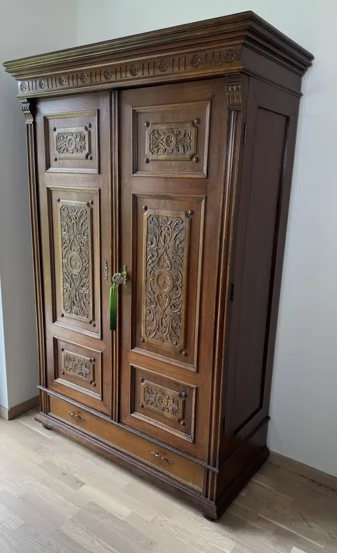 • Altdeutscher Schrank – Kasten mit Regalfächer Antik mit Schnitzerei H 201 cm B 132 cm T 72 cm