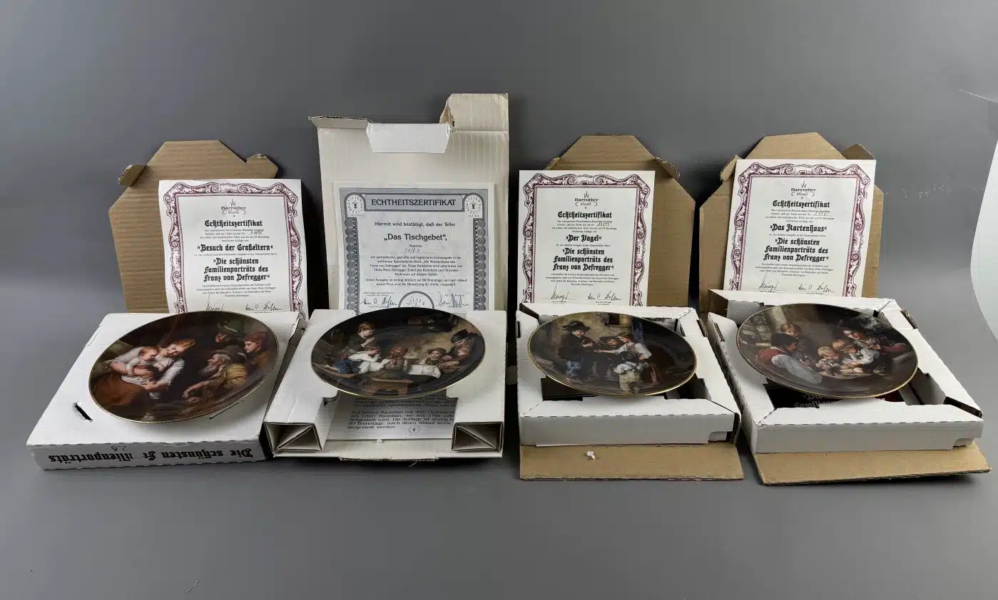 • 4 Stück – Sammelteller Die Meisterwerke des Franz von Defregger Bradex limitierte Auflage, nummeriert und beschriftet, mit Zertifikat, guter Erhaltungszustand OVP