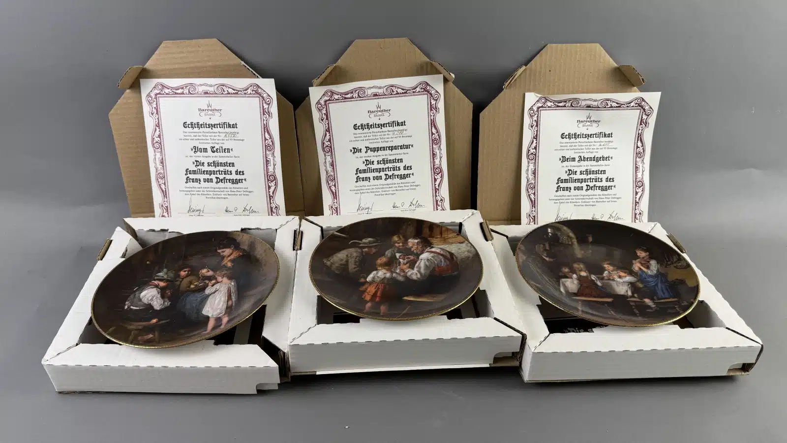 • 3 Stück – Sammelteller Die Meisterwerke des Franz von Defregger Bradex limitierte Auflage, nummeriert und beschriftet, mit Zertifikat, guter Erhaltungszustand OVP