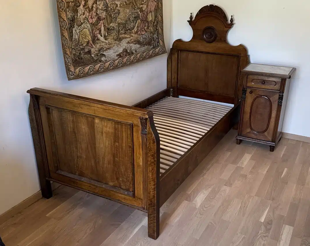 • Antikes Bauernbett Gründerzeit 200×90 cm mit dazugehörigem Nachtkästchen