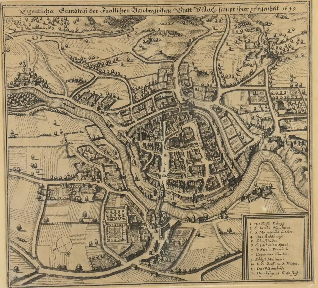 • historischen Kupferstich, Eigentlicher Grundtriß der Fürstlichen Bambergischen Statt Villach sampt ihrer gelegenheit 1649, 32×29 cm Rahmen 50×50 cm