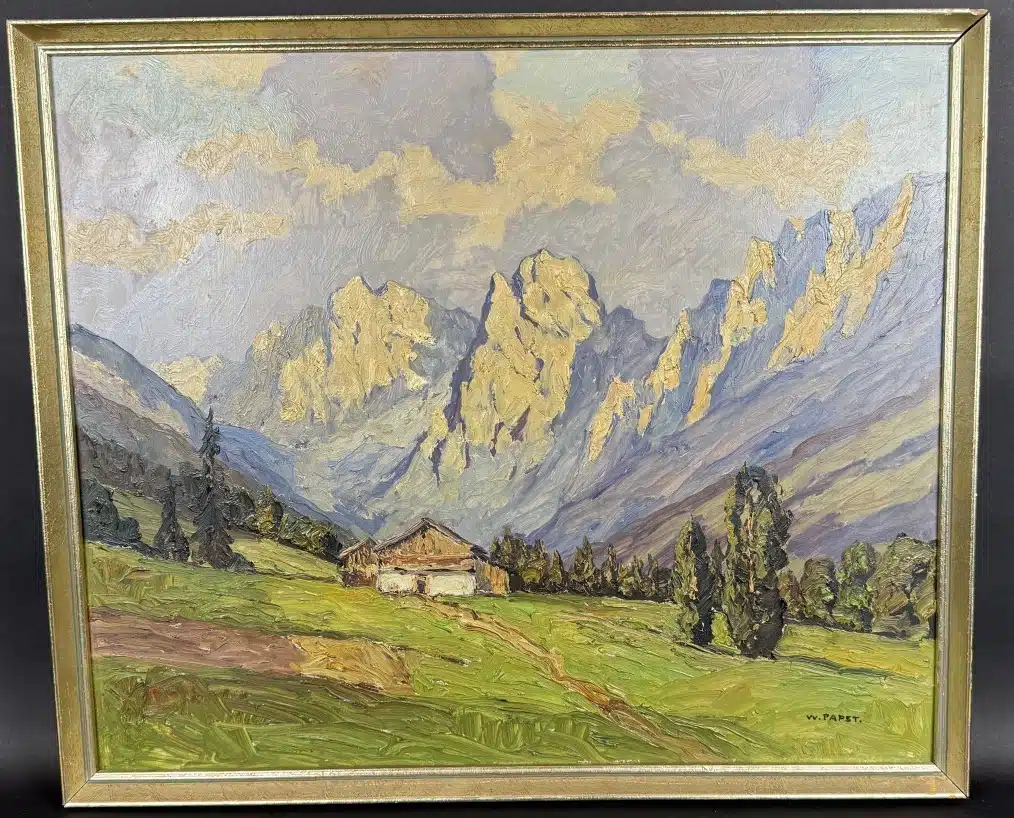 • Walder Papst, (geb. 1897 St. Leonhard/Marburg, tätig als Maler in Graz) rückseitig betitelt kaiser Gebirge, signiert W. Papst, Öl auf Faserplatte, 62×52 cm