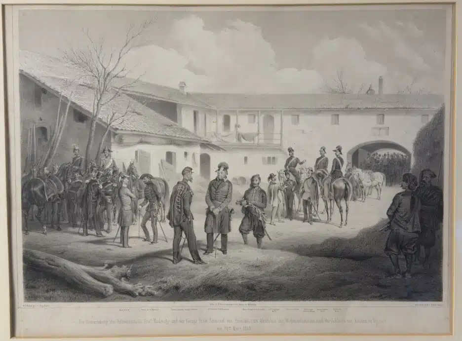 • Lithografie, König Viktor Emanuel II. (Haus Savoyen, 1849-1861 König von Sardinien-Pietmont) und Feldmarschall Radetzky nach der Schlacht von Novara, in der am 23. März 1849 die österreichischen Truppen unter Radetzy die königlichen Truppen besiegten 45×34 cm Rahmen 66×50 cm