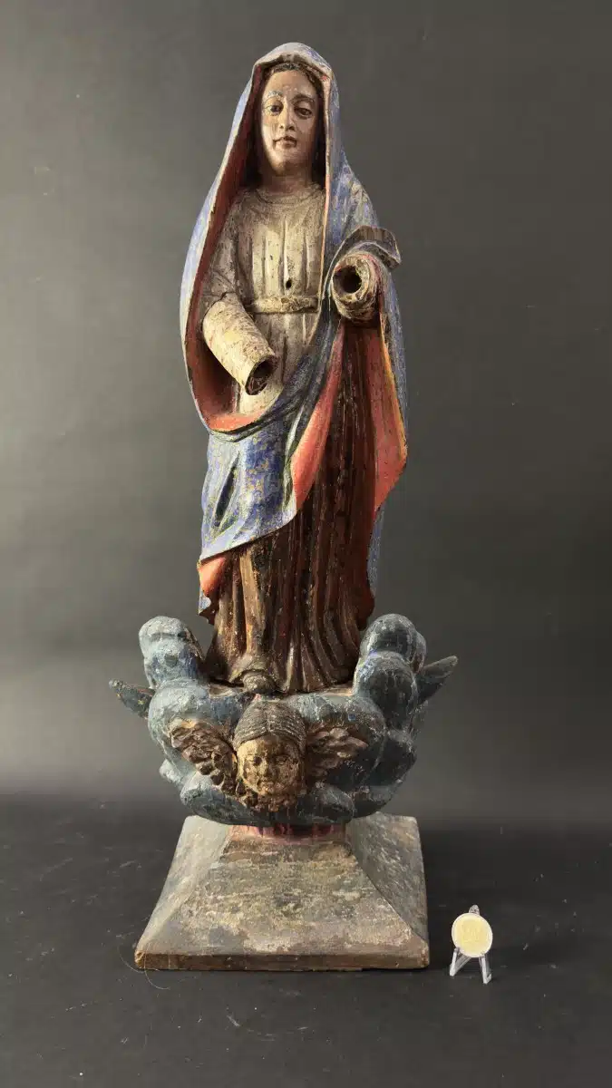 • Holz Statue der Jungfrau Maria, 2 Teilig auf Sockel H58 cm