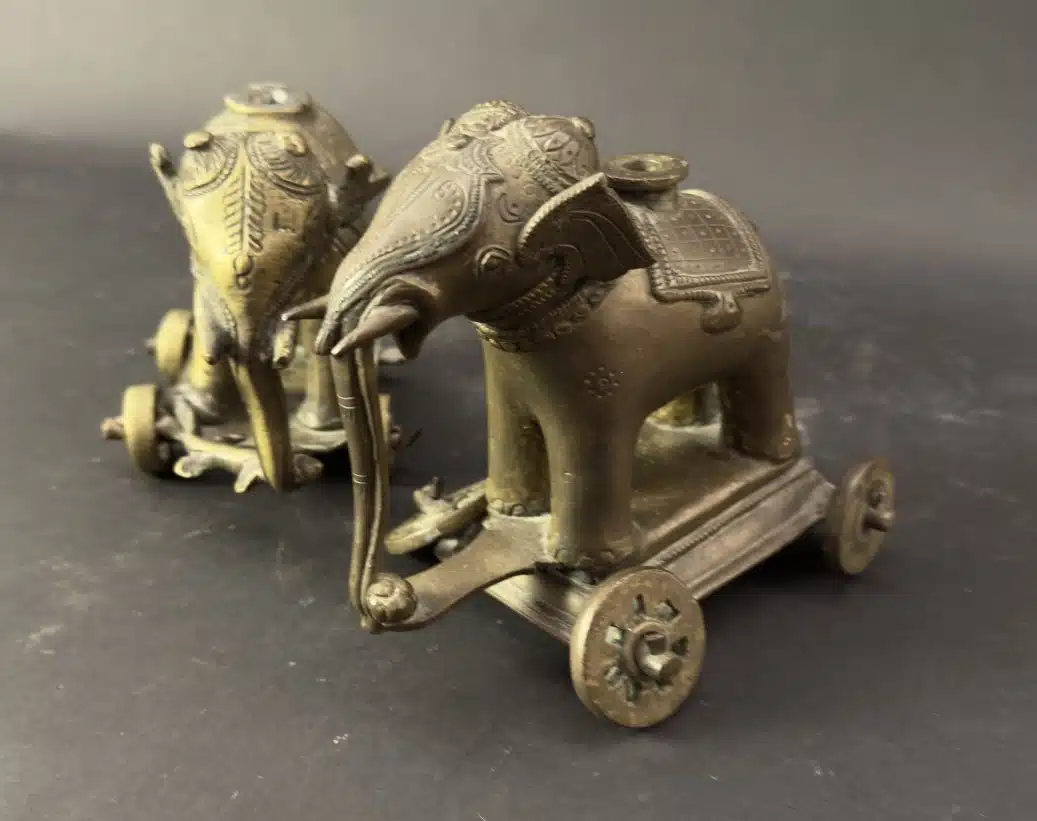 • 2 Messing Elefanten auf Rädern, Symbol für Glück, Wohlstand, Stärke und Weisheit, ein Rad fehlt