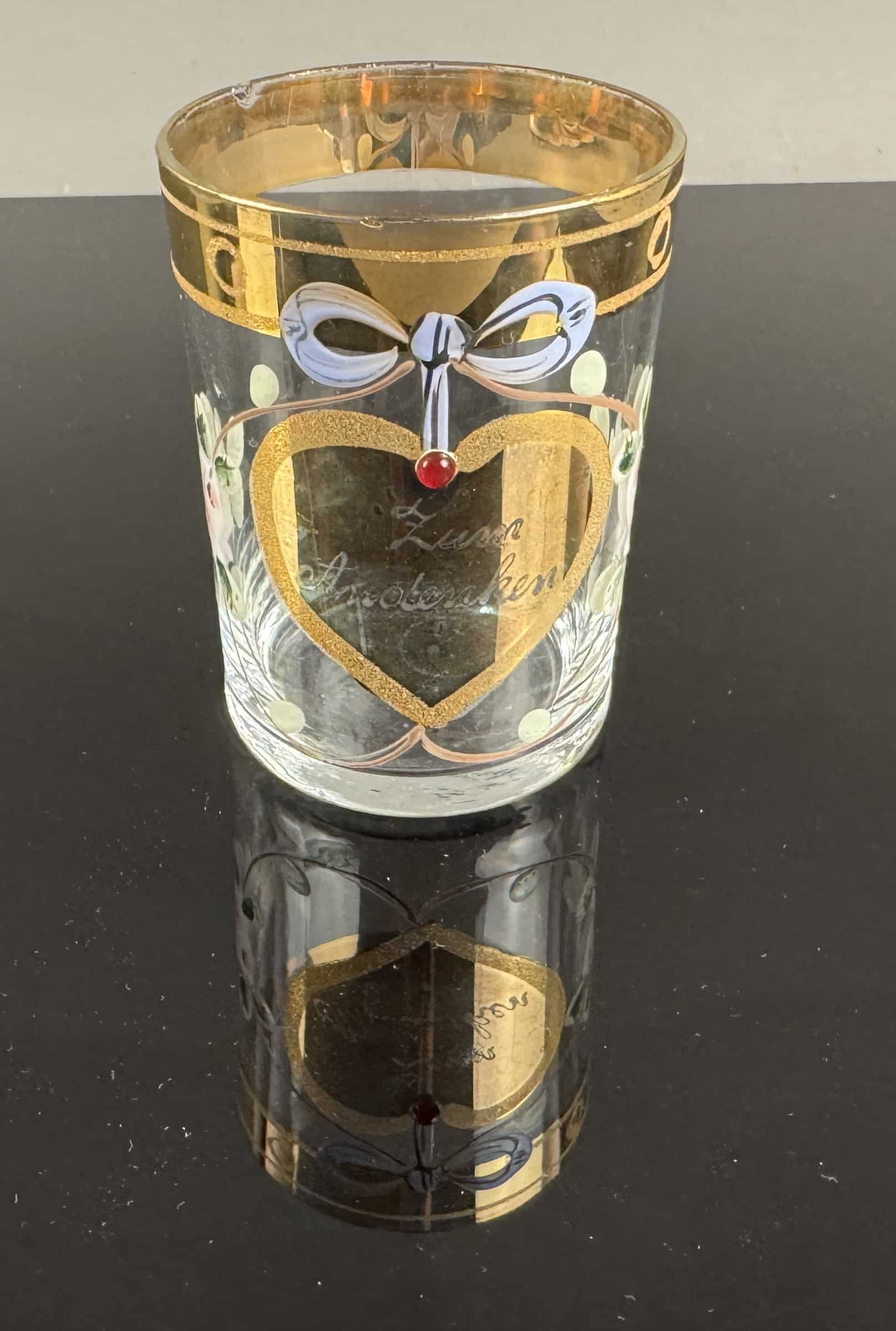 • Switbert Lobisser – Aus persönlichem Besitz – kunstvoll verziertes Glas mit Goldmalerei und einem Herzmotiv „Zum Andenken“