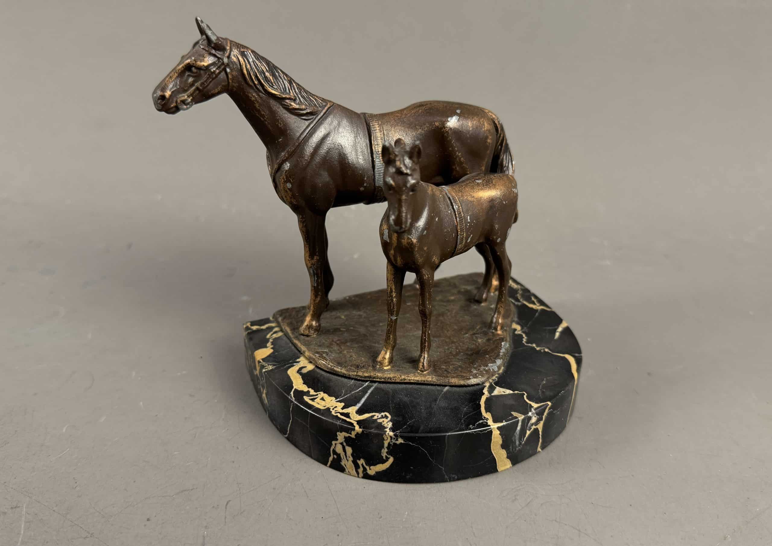 • Switbert Lobisser – Aus persönlichem Besitz – antike Statue von Pferd und Fohlen, auf schwarzen Marmorsockel montiert, 13×10 cm H 14 cm