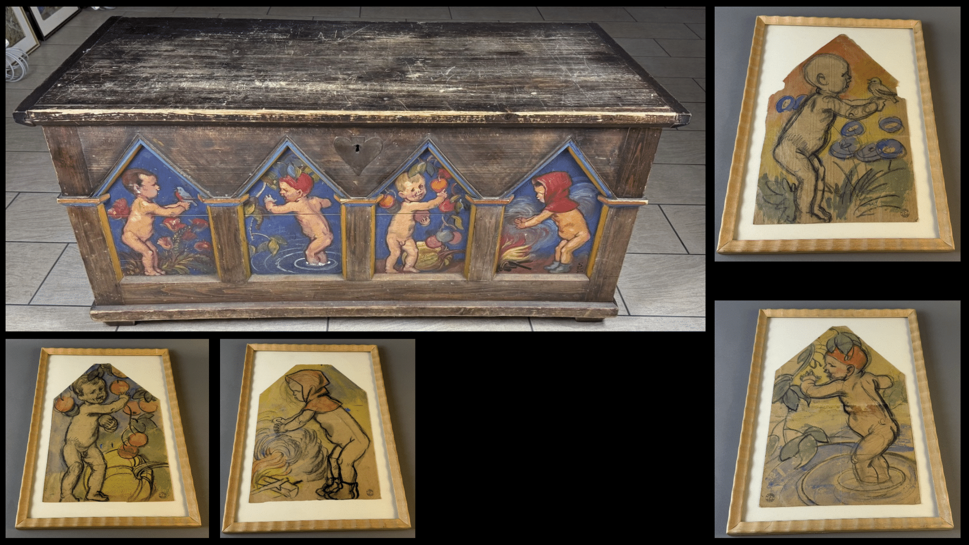 • Switbert Lobisser – Aus persönlichem Besitz – Bauerntruhe seiner Eva „Ev“ Luise Bleymaier mit den 4 Jahreszeiten von Lobisser bemalt, Frühling, Sommer, Herbst, Winter L 154 T 70 H 79 cm 4 Stück – Kohle und Aquarell – Entwurf zur Bauerntruhe seiner Ev. siehe Beschreibung Abholungsort: Galerie Magnet Völkermarkt !!