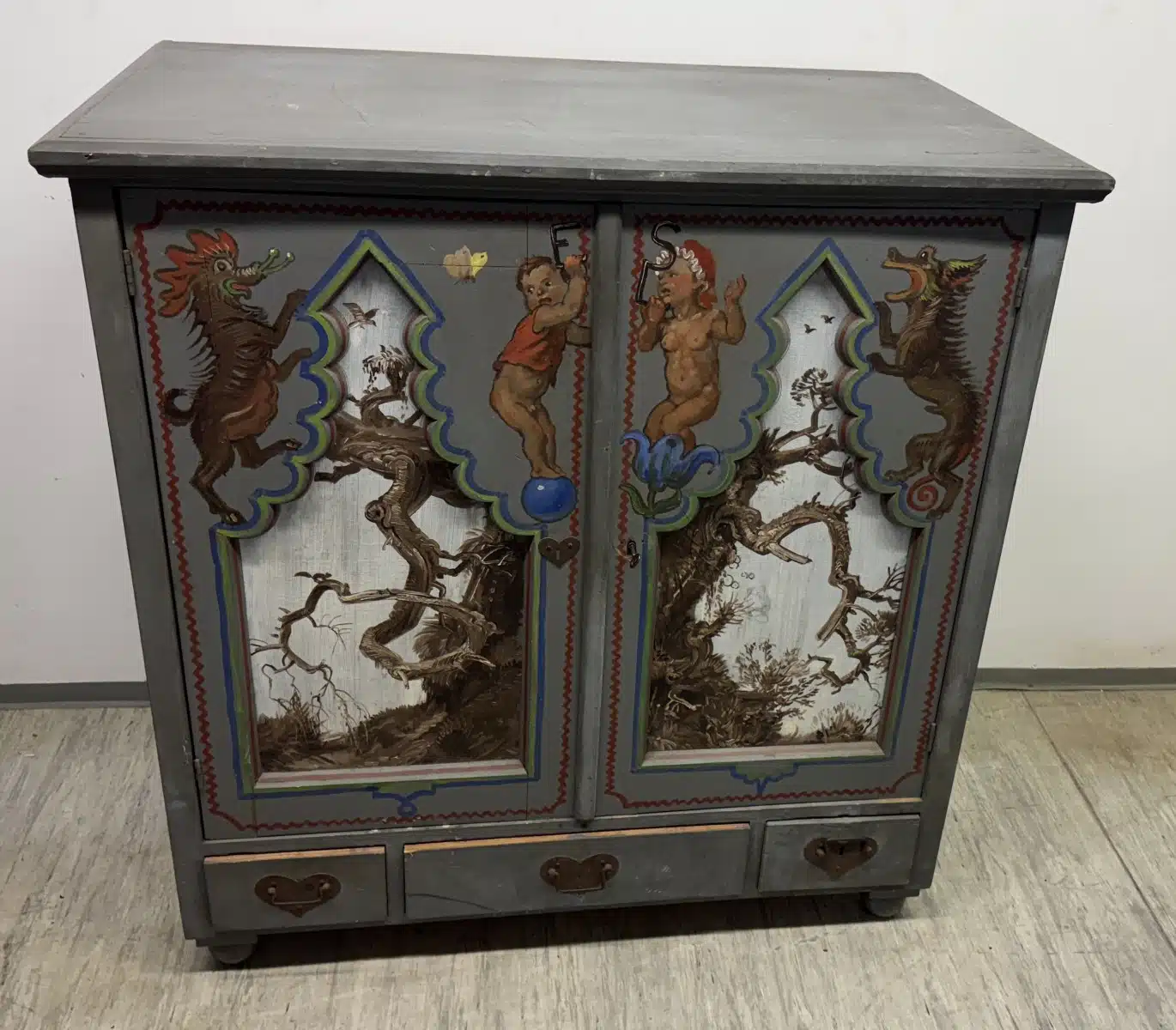 • Switbert Lobisser – Aus persönlichem Besitz – von Lobisser bemalter Holzschrank, b 115 cm T 66 cm H 121 cm Abholungsort: Galerie Magnet Völkermarkt !!