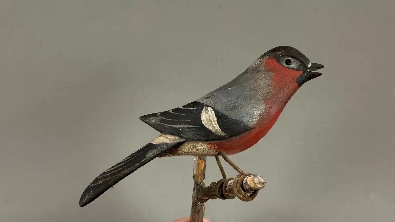 • Switbert Lobisser – Aus persönlichem Besitz – Viechtauer Vogel, Gimpel, Anfang 20. Jh., Holz bunt gefasst, Glasaugen, auf Ast sitzend, Vogellänge 16 cm,