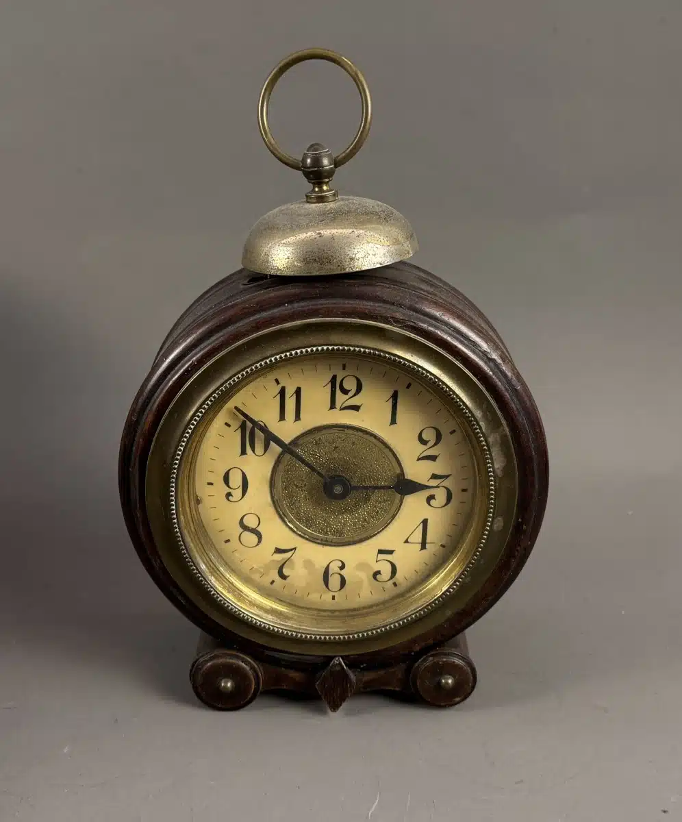 • Switbert Lobisser – Aus persönlichem Besitz – antiker Wecker mit Holzgehäuse H 26 cm