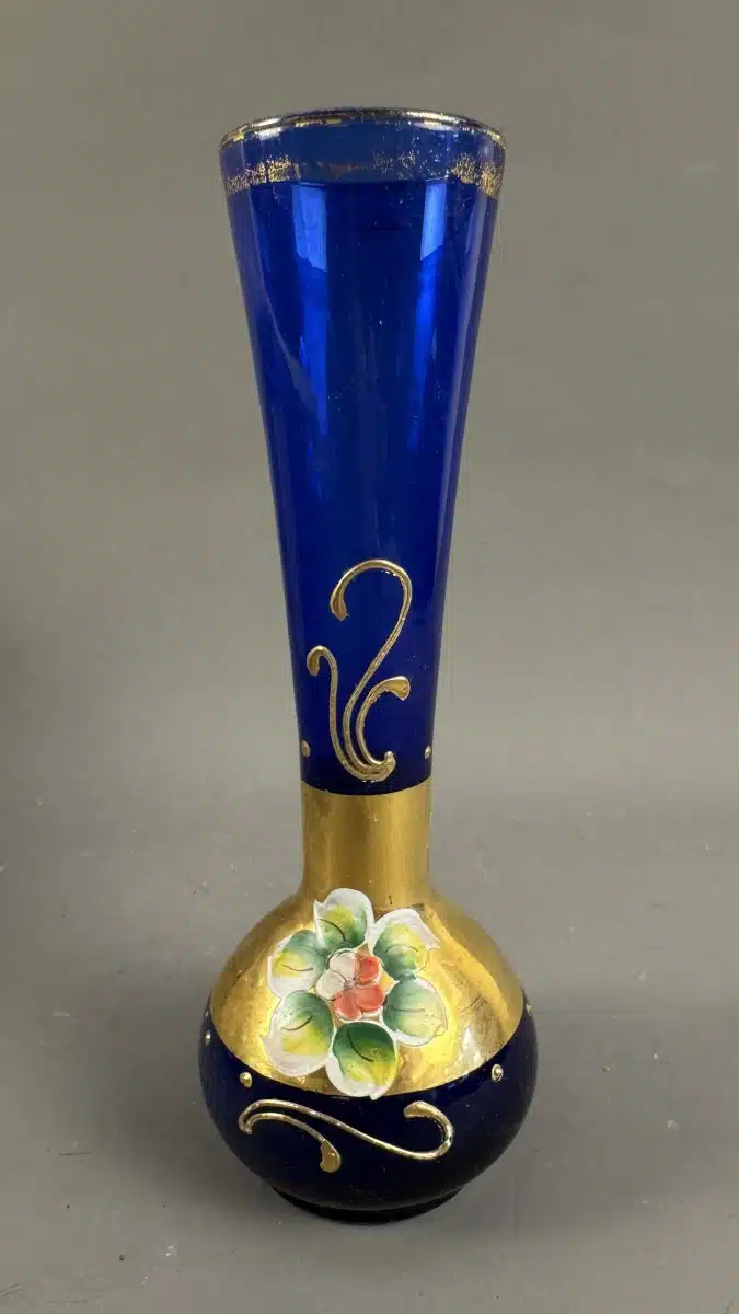 • Switbert Lobisser – Aus persönlichem Besitz – böhmische Kobaltglasvase mit Goldverzierung und handgemalten Blumenmotiven H 20 cm