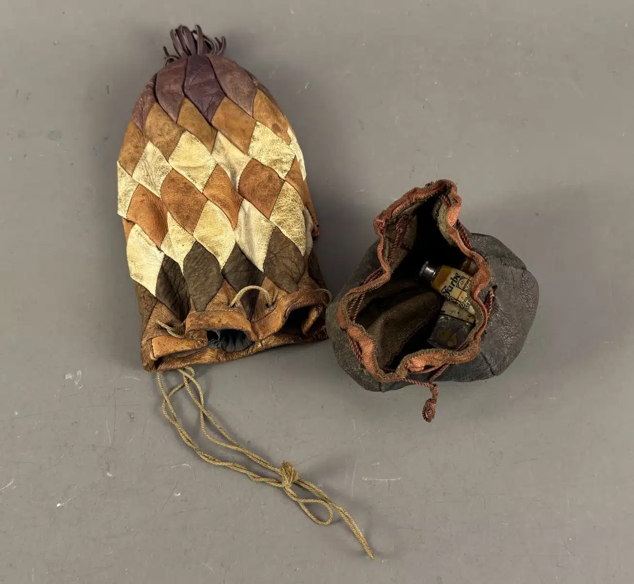 • Switbert Lobisser – Aus persönlichem Besitz – historische Zugbeutel, Leder, in dem Künstlerbedarf wie Farbtuben aufbewahrt wurden