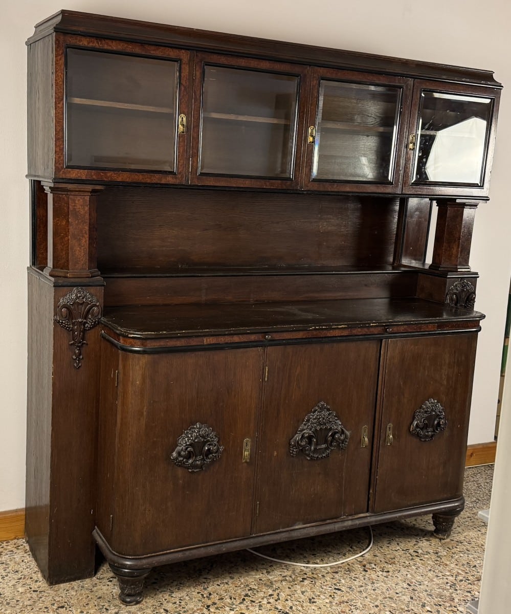 • Buffetschrank, Anrichte, Kredenz, 3 Schubladen, sowie 7 Flügeltüren, die 4 Türen im oberen Bereich sind mit Glaseinsätzen, Gläser mit Facettenschliff, schöne Schnitzereien, herrliche Beschläge, B 200cm T 70 cm H Kommode 100 cm Aufsatz H 101 T 40cm !!! Abholungsort Auktionshalle HELGUS !!!