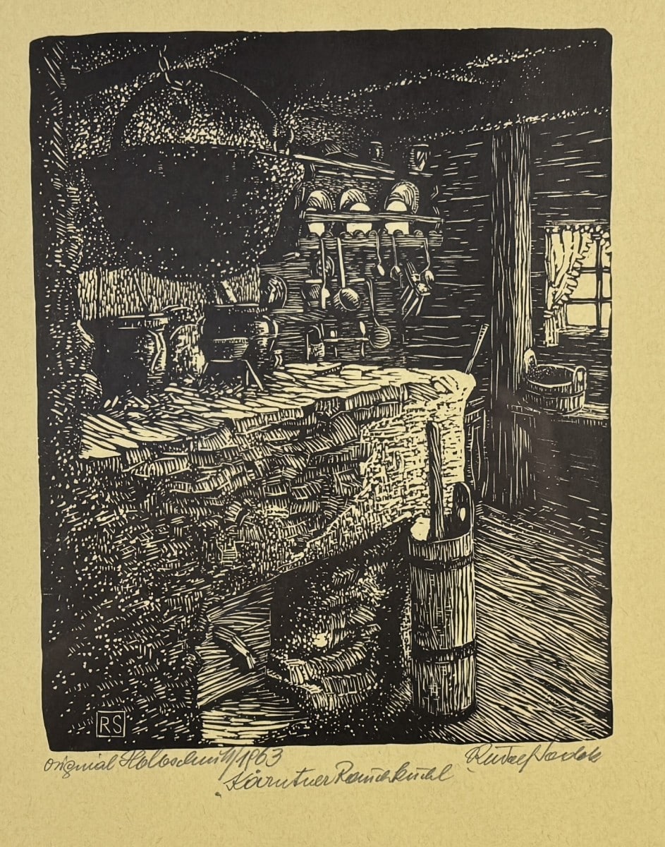 • Rudolf Sodek (Althofen 1916-2004) Holzschnitt, „Kärntner Rauchkuchl“ datiert 1963. signiert 26x33cm Rahmen 53×43 cm