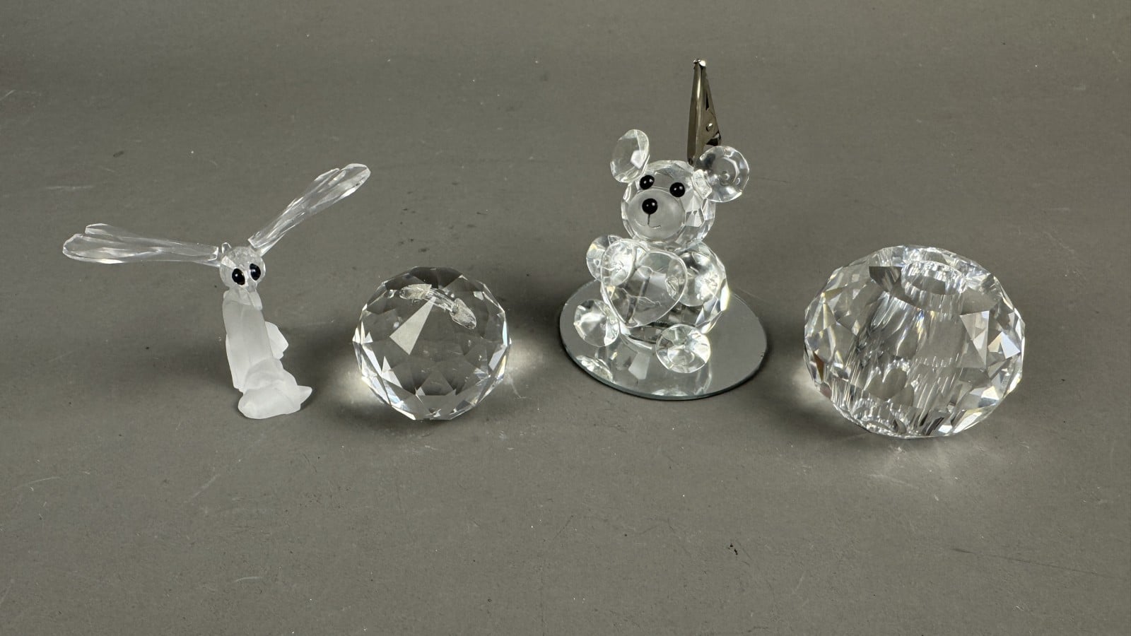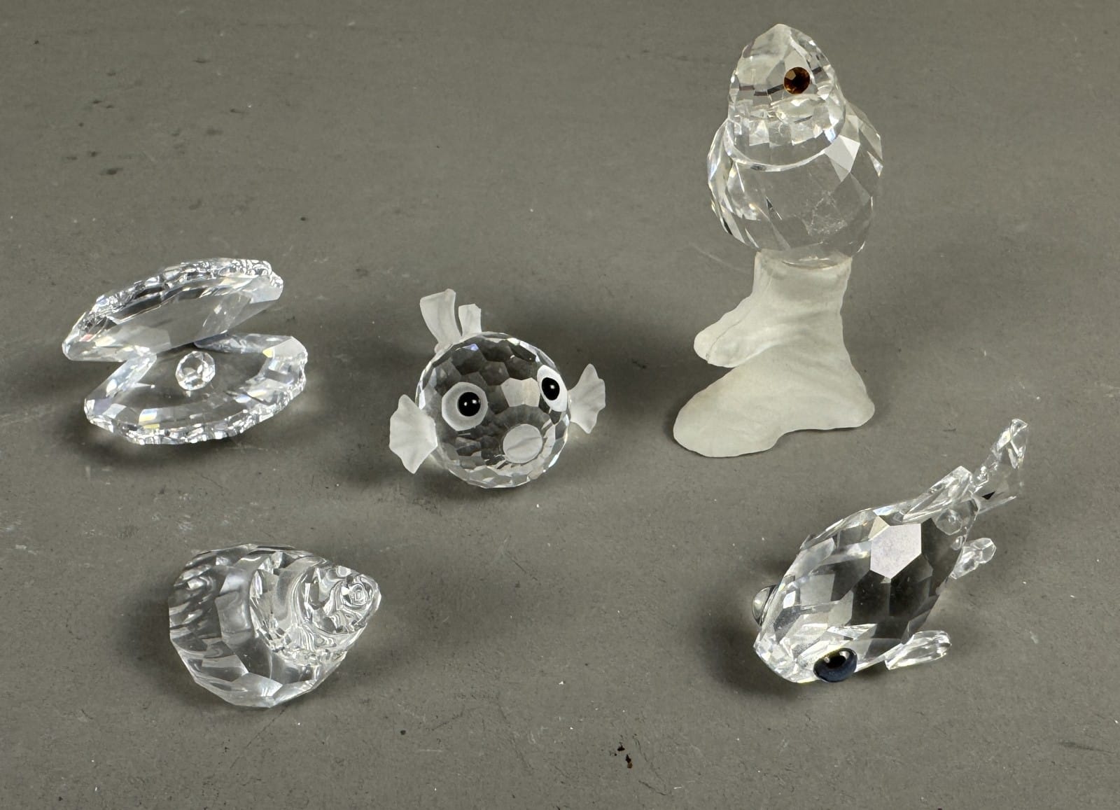 • 5 Swarovski Kristall Figuren, Fisch, Kugelfisch, Muschel mit Perle, Kegelschnecke,
